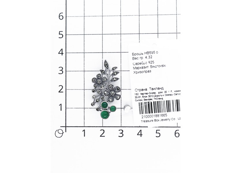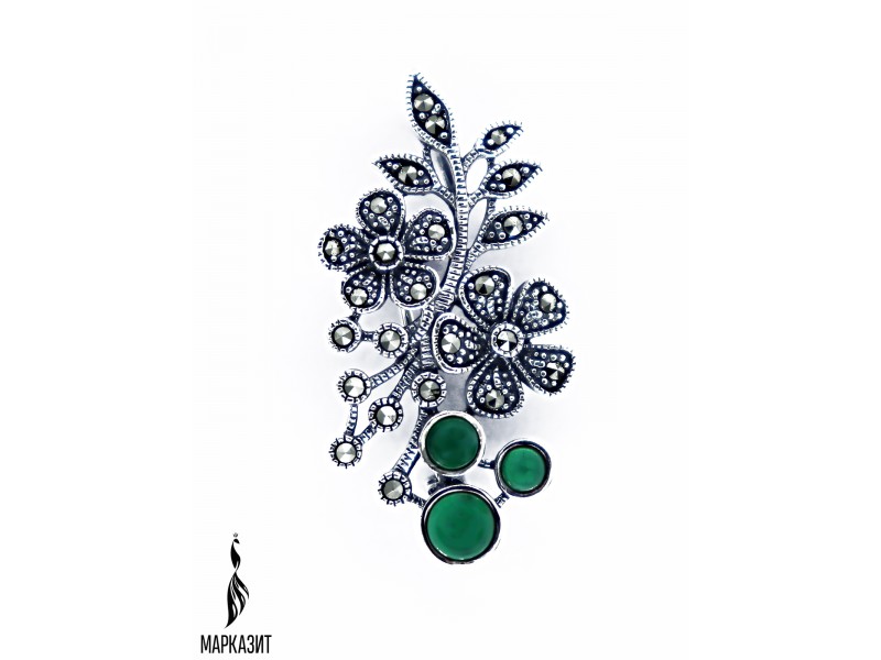 Серебряная Брошь арт. HB595 Марказит Swarovski, Хризопраз