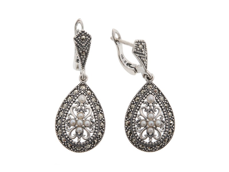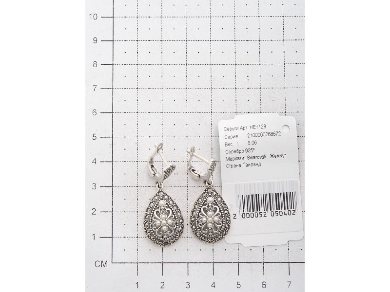 Серебряные Серьги арт. HE1128 Марказит Swarovski, Жемчуг
